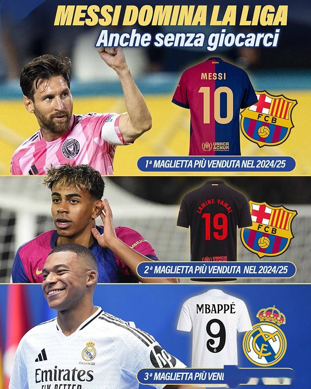 西甲球衣销量前三:梅西“缺席”仍领跑,亚马尔、姆巴佩上榜