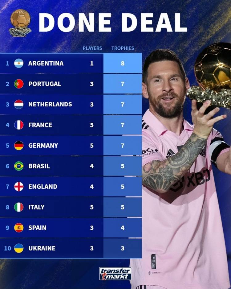 德转统计各国金球奖数量:阿根廷第一!全都是梅西!